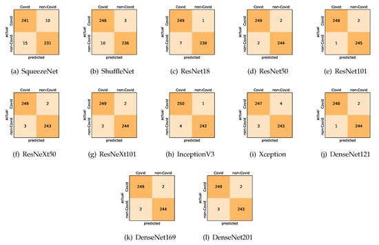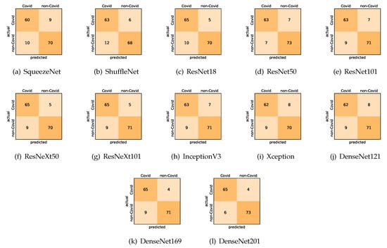 Our models achieved fairly good performance compared with the recently published work using the exact network architectures. Here, we see that DenseNet201 outperformed all other architectures. The model achieved average accuracy and sensitivity scores of and , respectively. It also identified all COVID-19 cases, with only four images, on average, being falsely predicted as non-COVID-19. DenseNet169 achieved the second best average accuracy of and a very high sensitivity identical to the best model. The DenseNet121 and Xception models achieved nearly identical results with respect to all evaluation metrics. We can observe that small networks such as ResNet18 achieved comparable results to those of other deeper models, whereas the SqueezeNet and ShuffleNet models performed at a similar level of accuracy. The variants of the ResNeXt models have comparable results and performed as well as the different ResNet variants. For detailed analysis and full understanding of the numbers of correct and misclassified cases for each individual model, see the confusion matrices presented in Figure 10.