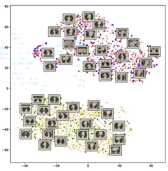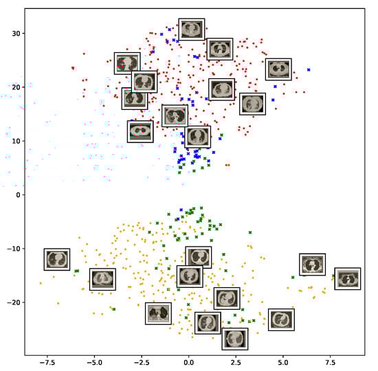 Visualization of the t-SNE embeddings for the entire COVID-19 CT dataset. As in Figure 11, we can see two different clusters representing COVID-19 and non-COVID-19 classes.