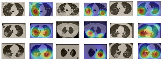 Grad-CAM visualizations for the same CT images in the first two rows of Figure 15. The CT images were correctly identified by SqueezeNet as COVID-19 cases with relevant localization of the disease-related regions.