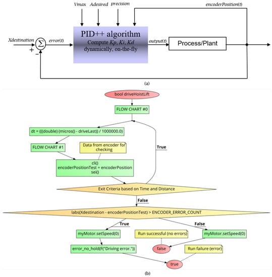 The MAIN LEVEL FLOW CHART (Figure 3b) presents the command line parameters of the PID++ algorithm in a C-like pseudo-code structure for lifting up or bringing down weights in a humanoid controlled motion fashion. The bool driveHoistLift function takes the PID++ , , , and user input parameters. Other inputs such as the are sensed every time intervals. In real time applications implemented in hardware, precise can be computed by keeping track of the current time with accuracies in the range of microseconds. Additional parameters such as the hold time for lift and maximum allowable drive interval are defined here using the ENCODER_ERROR_COUNT variable.