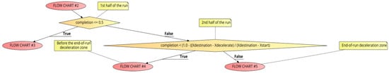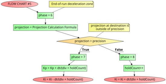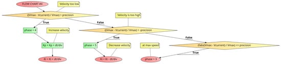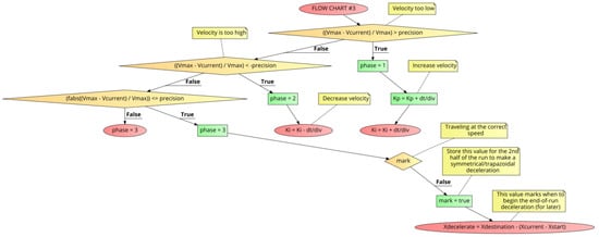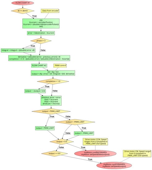 Figure 8 shows FLOW CHART #1 which shows the output control structure of the PID++ algorithm which is executed periodically in the Main Loop, every . At this programming level, a set of PID coefficients (, , ) have already been set. Using these current coefficient values, the running output (Equation (2)) is determined and used to control the motor, with adjustments made every depending on the phase of the run.