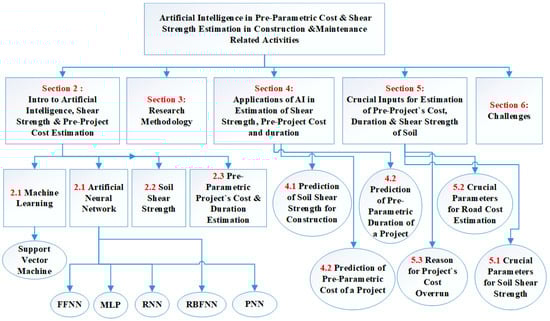 Some applications of geotechnical and civil construction engineering where AI models can be used include (a) the estimation of soil shear strength related to its ability to bear high load and external pressure due to floods and other natural calamities, (b) the prediction of concrete compressive strength, (c) the prediction of concrete-beam shear strength [25,26,27], (d) the prediction of the shear strength of peaks [28], walls [29], rocks [30], etc., and (e) the accurate estimation of pre-project bid cost and duration with minimal risk of cost and duration overrun.