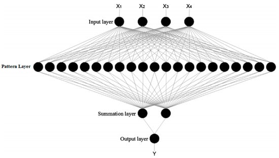 For the estimation of soil shear-strength parameters, the authors in [64] made use of PNN, in which input parameters such as water content, dry density of soil, and the percentage of gravel, sand, silt, and clay in soil were considered. Two soil shear-strength parameters, cohesion and internal friction, were predicted using the neural network in this work. A total of 300 soil samples from 20 different boreholes in Ranchi, Jharkhand, India were collected and used in this work. The PNN model in this work had four layers, namely, (i) input layer, (ii) pattern layer, (iii) summation layer, and (iv) output layer, as shown in Figure 3. The input layer of the proposed model consisted of one neuron that fetched one set of new input data, i.e., the test data. Similarly, the pattern layer comprised 300 neurons, and each neuron had one set of input data with information on the seven soil parameters. The summation layer consisted of 16 neurons and represented each class. In the output layer, there was one neuron which output the best class. On the basis of the results, the authors concluded that neural models gave better results than mathematical models.