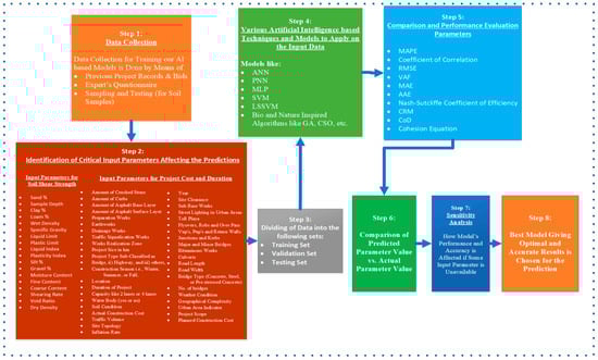 Basic steps involved in the use of AI-based models in the prediction and estimation of shear strength and pre-project cost and duration throughout the construction of roads.