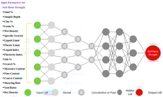 AI-based approaches are very useful in nonlinear modeling and can take several input variables into account when determining soil shear strength. AI models are also flexible and can adjust their structures according to changes in the collected geotechnical data [66]. A general ANN-based model depicting the use of various input parameters for the prediction of soil shear strength is shown in Figure 6.