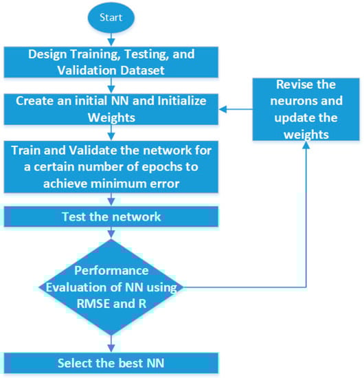 Similarly, the authors in [67] used a regression tree and ANN for the computation of soil shear-strength parameters such as cohesion and angle of internal friction. Six input parameters (namely, sand, silt percentage, gravel percentage, clay percentage, plastic index, and dry density) were used and fed as input to the ANN and regression tree-based model for the prediction of soil shear strength. A total of 115 soil samples were considered, of which 90 were used for training, while the remaining 25 were used for testing the performance of the model. The correlation coefficient (R) and root-mean-square error (RMSE) were evaluated for both the regression tree and the ANN during the performance evaluation, and it was observed that, for the prediction of internal friction angle, both techniques performed equally well, whereas, for the estimation of cohesion, the ANN outperformed the regression technique. Furthermore, all six input parameters considered were found to be important for the estimation of shear parameters. MATLAB software was used for the coding and implementation of the model. The flow of the proposed ANN model for the calculation of shear-strength parameters is shown in Figure 8.