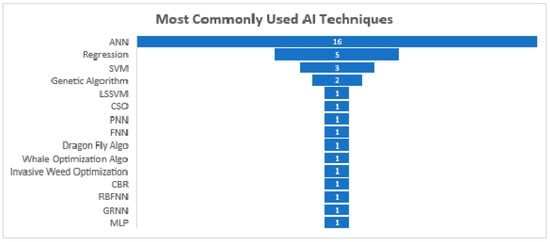 For the construction of robust houses, the estimation of soil shear strength is crucial. The authors in [70] hybridized AI-based support vector regression (SVR) and particle swarm optimization (PSO) for the prediction of soil shear strength. A set of 12 input parameters, namely, plastic limit, moisture content, void ratio, content of sand, liquid index, plastic index, dry density, liquid limit, loam content, sample depth, wet density, and clay content, were fed to the AI-based model for prediction. A dataset containing 443 samples of soil collected from a Vietnam housing project was used for the training and validation of model performance. In this hybrid AI model, SVR was used as the function optimization method for providing the mapping to predict the soil shear strength using the considered input parameters. PSO was used for optimizing the training phase of the SVR’s function approximator. For the evaluation of model performance, metrics such as MAPE, RMSE, and R2 were used, and it was observed that the author’s proposed hybrid AI-based model consisting of SVR and PSO yielded better prediction accuracy in terms of RMSE, MAPE, and R2 with values of 0.038, 9.701%, and 0.888, respectively.