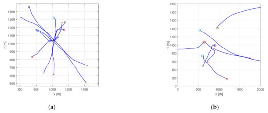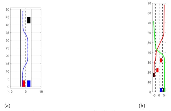 Two scenarios were designed to evaluate filter performance in simple simulated traffic situations (Figure 11). Rectangles represent the vehicles, and the color indicates whether one is observed (black) or in an occluding object (red). The ego vehicle, drawn as blue, is the observer. Lines represent the trajectories of other vehicles relative to the ego vehicle. The first scenario consists of a two-lane road and three vehicles (Figure 11a). The vehicles in the right lane are moving at the same constant speed. The vehicle in the left lane moves with speed difference and performs two-lane changing maneuvers, and while moving in the right lane, it occludes the observed vehicle. The simulation’s duration is 100 s, and the observed object is occluded in the time interval [35 s, 64 s].