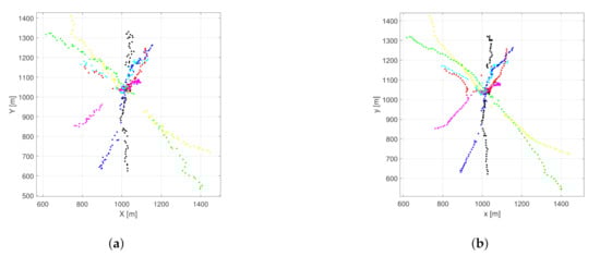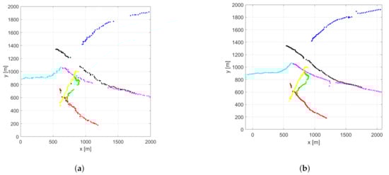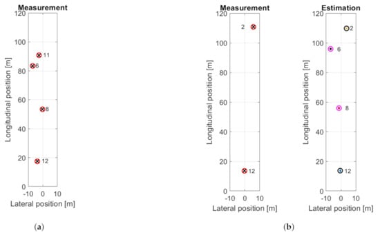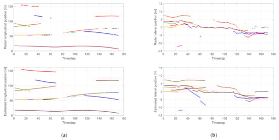 Figure 15b belongs to timestep 60 where there are two radar measurements and six estimated objects. Please note that two objects are out of the plot range: the red trajectory at 150 m longitudinal position and the black trajectory at 20 m lateral position in Figure 14.