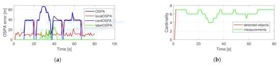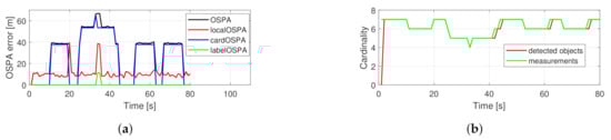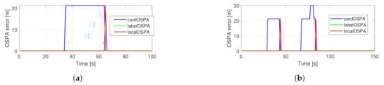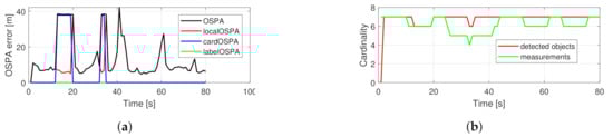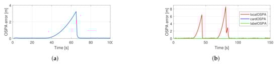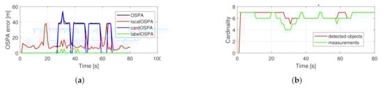The original filter’s performance in the simulated traffic situations can be seen in Figure 12. As expected, during occlusion, the OSPA error is dominated by the cardinality component, and after re-detection, the localization error component is significant. The performance of the proposed filter is shown in Figure 13. In this case, no cardinality error occurs, and the localization error increases gradually as the estimation becomes more uncertain during occlusion. The actual scaling of the cardinality error depends on the cutoff distance, hence the information gain manifested through the correct cardinality estimates should be tuned via this parameter.