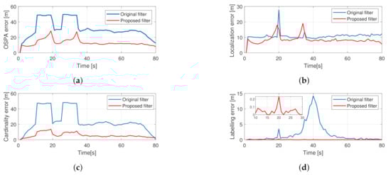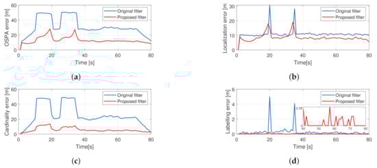The overall filter performances are compared in Figure 10. The advantage of the proposed filter regarding the OSPA error is similar to in the crossing trajectories scenario. Regarding labeling error, the original filter performs reasonably; however, the predefined measurement outages are recognizable. For the proposed filter, labeling errors are minimal.
