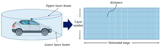 The selection of this vertical range is not arbitrary, but is due to both the technical characteristics of the device and its placement in the vehicle. From 5 degrees upwards, the laser beam hardly hits any obstacles. Similarly, from −9 degrees downwards, the laser directly hits the roof of the vehicle. Therefore, the portion of the image that really varies while driving is the one extracted from the specified interval.