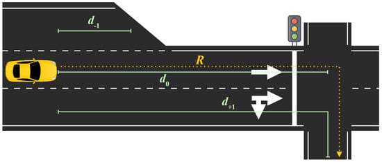 The values are extracted from the measurement of the distance at each instant from the position of the vehicle to the position of a series of checkpoints scattered throughout the scenario. These checkpoints refer to spatial positions of no return, i.e., those points from which it is impossible to continue driving along the pre-established route. For example, in Figure 3 it can be seen that, although there is no physical impediment to continue driving in the lane corresponding to distance , the route imposes a right turn, so the distance is measured up to the point at which the change of direction can no longer be performed.