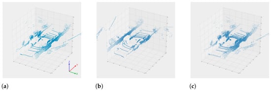 Example of the augmentation techniques: (a) The original pointcloud. (b) After a mirroring process. (c) After a shaking process (2 cm).