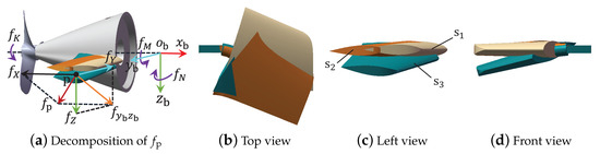 Proposition 7. When the fault has been confirmed on the vertical rudders outside the hull, the vertical rudder can be chosen; it can produce a relatively large but opposite force against along axis to turn an appropriate angle to provide additive . If the newly acquired , the adjusted vertical rudder is faulty; otherwise, the opposite one is faulty.