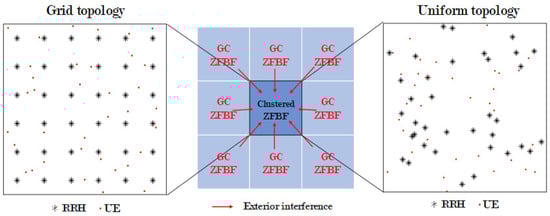 where is the desired signal from the desired ith RRH to the desired ith UE, and is the channel gain received in the desired cluster C. N is the number of RRHs in desired cluster C. is the signal from the N RRHs, except for the ith RRH in cluster C to the ith UE. Assuming perfect channel state information, the intra-cluster interference converges to zero owing to the orthogonal characteristics of the ZF precoding. As depicted in Figure 1 and Figure 2b, is the channel gain received from the M RRHs of other cluster in the desired area, and is the signal from the M RRHs of the other cluster to the ith UE. is the channel gain received from the exterior clusters in the eight exterior areas . denotes the additive white Gaussian noise with zero mean and variance of the ith UE. The channel coefficient used in (1) assumes a flat fading channel. For the path-loss and shadowing model, the urban micro-street canyon model of IEEE TR 38.900 is used [31]. , , and occupy the same resource block. In (1), interference is categorized into three types: Intra-cluster, inter-cluster, and exterior interferences. The intra-cluster interference is generated inside the precoding matrix of the desired cluster C, inter-cluster interference is generated by the weight matrices from the other clusters in the desired area, and exterior interference is applied from clusters of the eight exterior areas. is the normalized ZF weight vector for each channel coefficient vector, , and is given by: