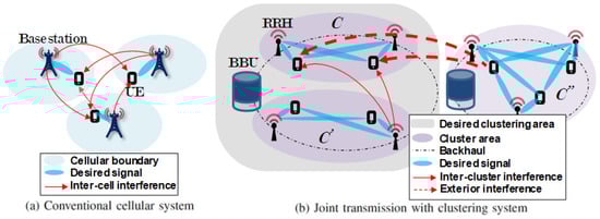 Concept of conventional cellular and joint transmission a with clustering system. (a): conventional cellular system; (b): joint transmission with clustering system.
