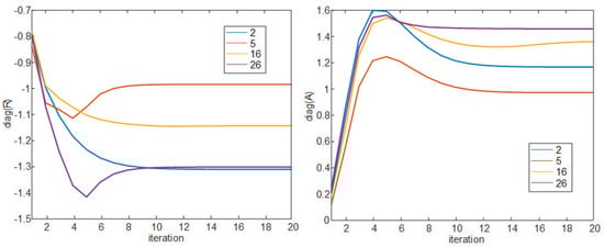 Diagonal component values of matrix by iteration in Algorithm 1 (2, 5, 16, and 26 data points).