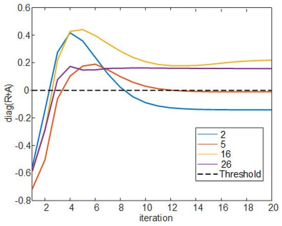 As shown in Algorithm 1, the similarity matrix is the input value, and the responsibility matrix and the availability matrix , which have the same matrix size as , are set to 0 matrix. Lines 3 to 7 calculate and update the and matrices. and in line 8 are oscillating factors, representing the weights for the past and present values of the and matrix that are iterated by lines 9 to 13, and both values are defined as 0.5. Lines 14 to 20 determine the exemplar. Among the diagonal components of the matrix after iteration, components larger than threshold 0 are called the exemplar. The cluster set included in the exemplars is determined by line 19. Figure 3 is a graph showing the convergence process of the diagonal components of matrices and with the iteration progresses for data points 2, 5, 16, and 26 as an example. In the case of Algorithm 1, it can be observed that convergence is usually achieved with 10 iterations. Figure 4 shows the convergence process of the diagonal components of the matrix, and the two data points 16 and 26 selected as the exemplar larger than threshold 0. (5) is the similarity matrix used in the uplink joint transmission proposed in [26]. In this paper, this similarity matrix is used for down-link joint transmission. The off-diagonal components of this similarity matrix are defined as the value dividing the down-link SINR to the ith UE by the SINR value when non-CoMP pair CoMP between the ith RRH and all other RRHs (p indexing). This is the value representing the gain when performing joint transmission with the ith RRH. Here, the meaning of indicates the ratio of the sum of the interference signal power received from all RRHs except the ith RRH plus noise power and the desired signal power received from the ith UE. The meaning of indicates the ratio of the desired signal power received by the ith UE from the joint transmission of ith RRH and pth RRH and the sum of the interference signal power received from all RRHs except ith RRH and pth RRH plus noise power. Diagonal components can be obtained by multiplying the values remaining after excluding the pair CoMP SINR from the off-diagonal components by , a coordinative parameter. In (5), adjusts the size of the preference and this value is determined to be 0.3. As decreases, the value of the diagonal components decreases and K decreases, and as increases, K also increases. We implement a basic AP algorithm using this similarity matrix in the following subsections, and propose a new clustering algorithm by adding an image processing method and another clustering algorithm.