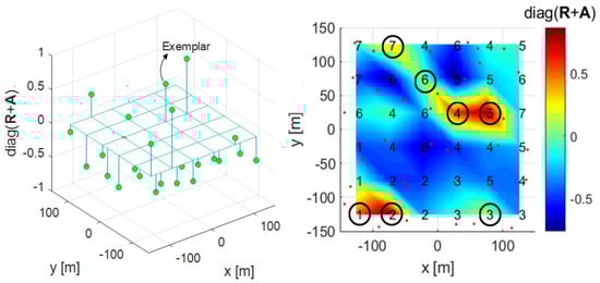 The AP clustering algorithm is a machine learning-based clustering technique that obtains a reasonable cluster combination and number of clusters through iteration. That is, the number of clusters does not need to be determined before the algorithm is executed. First, a similarity matrix is designed based on the characteristics of the data points, and each component of this matrix is updated and converged through iteration. Finally, the converged matrix is used for clustering [20]. As the similarity matrix is the only input value, the design of the matrix and setting the initial values almost dominate the clustering performance. The similarity matrix is divided into diagonal and off-diagonal components. Diagonal components are called preferences and are terms that pertain mainly to the number of clusters . Off-diagonal components are values that pertain mainly to the combinations of data points that constitute the cluster. Although it is not an input value of this algorithm, there is one more parameter to effectively control the number of clusters, which is a threshold set to the default value of zero. Among the diagonal components of the final matrix after the iteration is completed, the components that exceed this threshold are called exemplars. The number of exemplars is equal to the number of clusters.