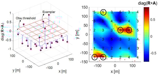 The second proposed clustering algorithm is a clustering technique that uses a greedy merging algorithm in addition to the proposed clustering Algorithm 1 proposed in Section 3.1. In this paper, a greedy merging algorithm creates one representative exemplar by grouping adjacent exemplars if exemplars are adjacent to each other. An exemplar serves as the center of the cluster, and there will be greater interference when these exemplars are adjacent to each other. Algorithm 3 shows the process flow of the proposed clustering Algorithm 2. Lines 1 to 13 are the same as for Algorithm 1, and lines 14 to 18, the process of applying the Otsu threshold, are the same as for Algorithm and these lines apply the Otsu threshold. Lines 19 to 23 determine the exemplar with the largest diagonal component of as the representative exemplar when it finds an adjacent exemplar among the exemplars that exceed the Otsu threshold. In Figure 6, 2, 3, and 4 exemplars are adjacent among the 5 exemplars that have passed the Otsu threshold. As exemplar 3 has the highest value, the rest are eliminated as exemplars, and exemplar 3 becomes the representative.