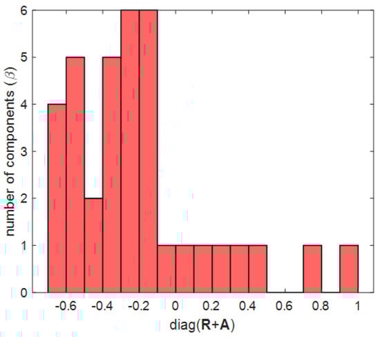The proposed clustering Algorithm 1 is a method of changing the fixed threshold 0 of the conventional AP clustering algorithm to a more suitable value for a given environment. One of the traditional image processing methods, Otsu’s method, is used in this clustering algorithm [30]. Otsu’s method can be selected as a method for binarization and transforms an image with several levels of gray including white and black into an image with only white and black. In [30], the criterion for dividing white and black is called the Otsu threshold. In this study, as a result of the mesh on the right of Figure 5, Figure 6, Figure 7 and Figure 8, the diagonal components of the matrix that determine the cluster in AP clustering are imaged through mapping to the topology. In Algorithm 2, the diagonal components of the matrix mapping information are used to determine the Otsu threshold in the Otsu’s method. The process of determining the Otsu threshold uses the distribution of black and white in the gray-scale histogram, and can be explained by (6)–(9). In the example of Figure 5, Figure 6, Figure 7 and Figure 8, the diagonal components of the matrix can be represented as a gray-scale histogram as shown in Figure 7. (6) shows the foreground and background weight value of the gray-scale histogram, and shows black as foreground(f) and white as background(b). T is the bin index, , and A is the total number of bins. For both and , all values from 0 to A are obtained for (6)–(9) (see Figure 7 as an example, ). (7) shows the foreground and background mean value of the gray-scale histogram, and shows the middle value of the bin width (Figure 7 as an example, −0.65, −0.55, …, 0.95). (8) shows the foreground and background variance value of the gray-scale histogram. (9) indicates within class variance, and eventually finds the index T that minimizes , and determines with that index as the Otsu threshold.