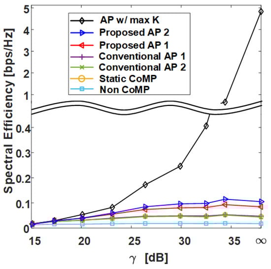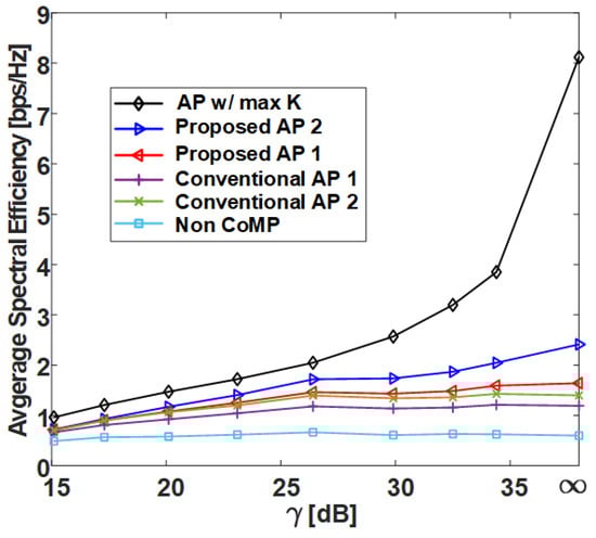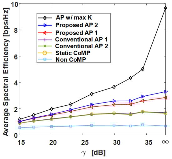 However, in the uniform topology, the static CoMP method is difficult to define, and therefore it is not added to the result. The non-CoMP result is also added as the lower bound result. Table 1 shows the simulation parameters used in the system-level simulator to derive the results. , which has a direct effect on the value, is set to 25.4 dBm, and is set to increase by 3 dBm from 10 dBm to 31 dBm, where [dB] on the x-axis is defined as the ratio of the average non-CoMP interference power to the average exterior interference power. Thus, the values in Figure 9, Figure 10, Figure 11 and Figure 12 indicate that the exterior interference is 0. The number of RRHs and UEs is set to 36, and each RRH and UE has a single antenna. In the grid topology, the inter-site distance between RRHs is assumed to be 50 m. In the uniform topology, the inter-site distance is not defined, but the RRH has a random location within the same area as the grid topology. The clustering SE performance is calculated by (4) in the situation where and are set, and both average SE and 5-percentile UE SE results are derived from Figure 9, Figure 10, Figure 11 and Figure 12.