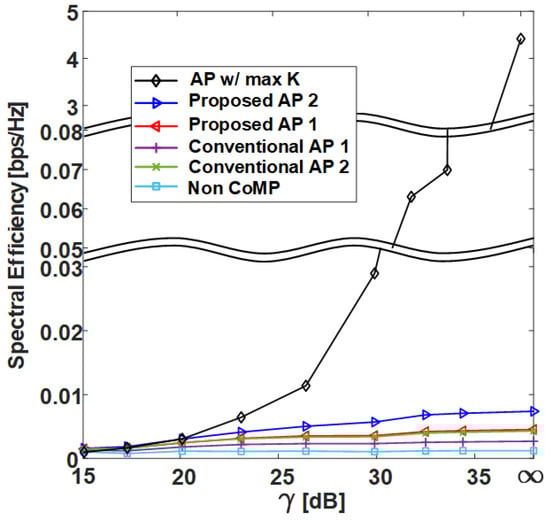 This method selects the most suitable K from a given similarity matrix and serves as the upper bound of the three AP-based clustering algorithms. The method of selecting the exemplar in Algorithm 4 is to calculate (3) in all cases from when K is 1 to the number of RRHs (=36), and the exemplar is the K having the highest SINR. This clustering method provides the optimal performance for K. Therefore, in the Section 4, this method will be referred to as AP w/max K, and the results of this algorithm will also be derived to address the extent to which the proposed clustering algorithms can exhibit a performance comparable to that of this clustering algorithm.