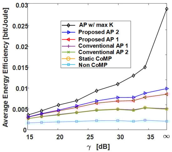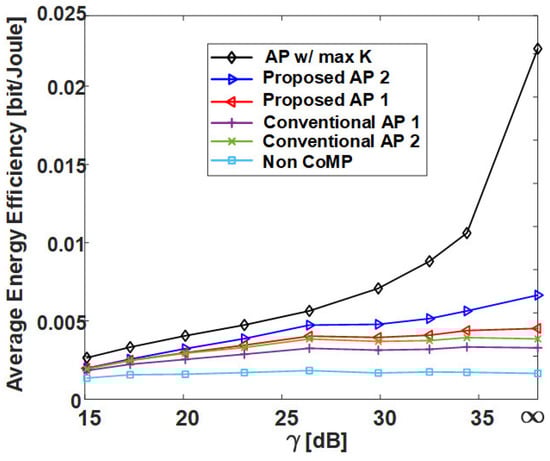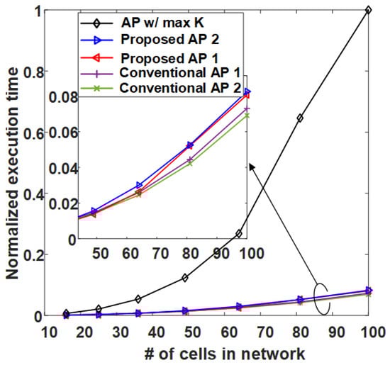 Figure 13 is the result of calculating the normalized execution time of AP-based clustering methods by the number of cells (RRHs) in the network. In Figure 13, the conventional AP clustering Algorithms 1 and 2 do not search the preference but use a initially defined similarity matrix. Naturally, the result of AP w/ max K shows the highest normalized execution time because the iteration is performed at least 36 times (the number of RRHs) more than the other algorithms. However, although the proposed clustering algorithms exhibit high performance in Figure 9, Figure 10, Figure 11 and Figure 12, they have a normalized execution time similar to that of the other existing AP clustering algorithms. Hence, the proposed clustering algorithms exhibit better performance than the conventional clustering algorithms without a significant increase in time complexity. This result is excellent in terms of energy efficiency because it shows a similar time complexity even with a better clustering performance than the conventional clustering algorithm. Figure 14 and Figure 15 show the average energy efficiency according to (5). This results show that the proposed AP clustering algorithm has a higher performance than the existing AP clustering algorithm in terms of energy efficiency.