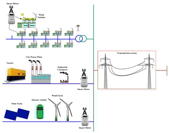 The modern power grid has a lot of challenges to cope with in the interpretation of renewable energy. This grid requires a new scenario to make it smart in order to manage the energy flow. Furthermore, the new scenario must take into account the interoperability of the old and new equipment. The new scenario has a lot of power suppliers, as shown in Figure 2, who provide their users with energy and supply the surplus to the main network. However, the discontinuity of renewable energy sources (photovoltaic and wind generation systems) increases the risk of the blackout to the whole network. So, the new power grid requires smart sensing about the variation of energy to cope with the sudden disconnection and the penetration of renewable energy resources.