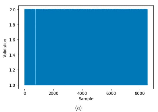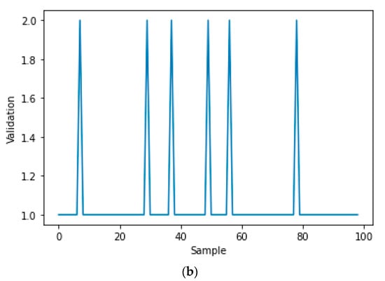 Figure 3 shows all samples of the inputs training dataset, that is represented by the current ‘I’ and its rate of change ‘Delta I’. Figure 4a shows all samples of the output training dataset, that is represented by the labeled validation (Real ‘1′, Fake ‘2′). Figure 4b is a zoomed in image of Figure 4a for a few samples of the output training dataset. All samples of the input testing dataset are clear in Figure 5, while all samples of the output testing dataset are shown in Figure 6a. Further, Figure 6b shows a zoomed in image for a few samples of the output testing dataset from Figure 6a. The process of the decision tree is described in Figure 7 and it includes the following components: