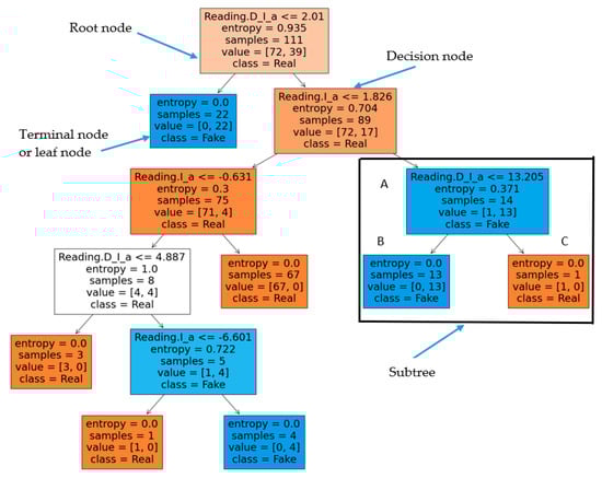 where p represents the probability of real data happening, and q represents the probability of fake data happening. Reference [30] compares the accuracy of the decision tree with other machine learning techniques: (1) Artificial neural network, (2) K-nearest neighbor, (3) Logistic regression, and (4) Naïve Bayes. Notably, the decision tree performed superior accuracy in a lot of works compared with the four machine learning algorithms. For this reason, the decision tree has been assigned in this work rather than the others.