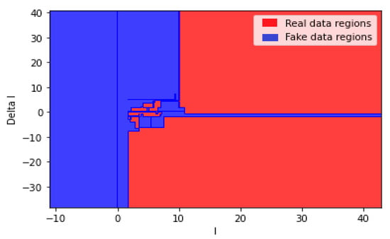 Figure 8 shows the output classification regions of the decision tree after training, while Figure 9 shows the locations of the testing data in the classified regions of real and fake data.