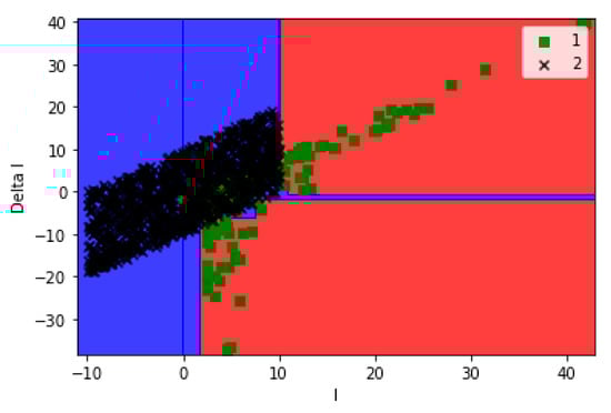 In this section, the decision tree is devoted to classifying the data of the smart meter. Then, the model created by the decision tree is encrypted with the smart system to provide online validation for the meter output via IoT. A real-time dataset is collected from the smart meter at different operation conditions for the training and testing of the decision tree. A fake dataset is added to the real-time dataset of the smart meter. The real data of the smart meter is labeled by 1 and the fake data is labeled by 2 in order to train and test the decision tree. The dataset is divided into training data by 70% and testing data by 30%. Table 1 shows a few samples of the dataset that are utilized to train and test the decision tree. The measured current ‘I’ and its rate of change ‘Delta I’ are utilized as the inputs of the decision tree. The Label of the real data and fake data is used as the output of the decision tree.