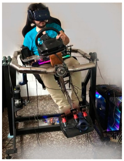 IL is a method that feeds from expert demonstrations [45,46]. Therefore, in this paper, the design and implementation of a movement platform with 2 Degrees of Freedom (DoF), which allows for emulating the main controls of a vehicle, are also presented. In this way, the human expert has a steering wheel, stereoscopic vision, and pedals, among other elements. Conversely, RL requires the adequate tailoring of a reward function, which encourages the IA to make the best decisions in order to obtain the best possible gain [46].
