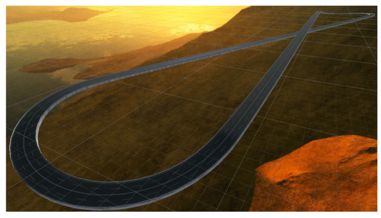 The IAs are trained in the track shown in Figure 5. This track has been designed with an “8” shape and its length is 2000 m, has four lanes with a width of 15 m in total, a slope whose difference in height is 20.1 m, and backstops.