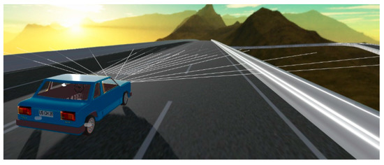 Figure 7 shows the virtual vehicle on the training track. The sensing between the vehicle and its remote and close surroundings can be observed thanks to the distance detector rays the virtual vehicle projects.