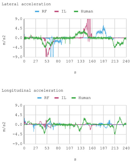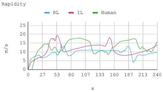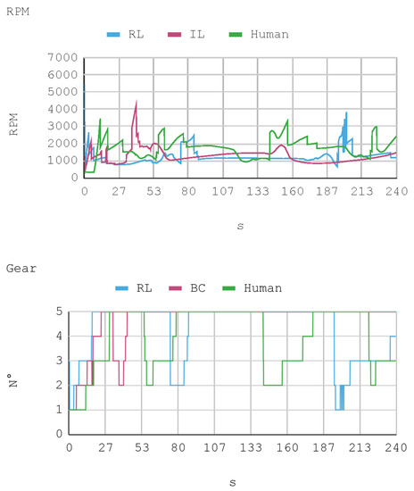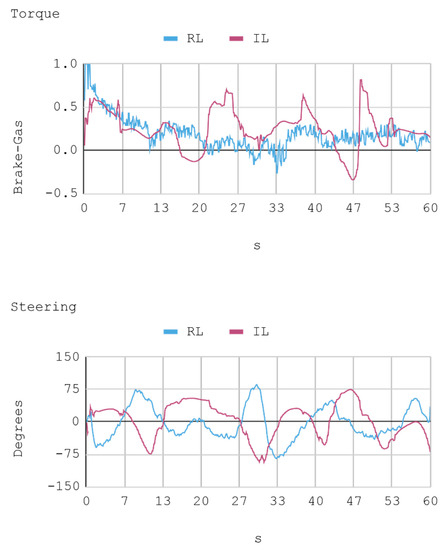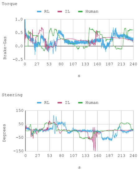 According to the classification presented in Li et al. [18], IAs could be assessed based on two criteria: Scenario-based testing and functionality-based testing. The first one judges the degree of intelligence thanks to which the IA reaches or not specific objectives, for example, whether an IA achieves circulation without any collision, or detecting a traffic sign. The second criterion establishes that a completely intelligent vehicle is one that executes all the functions that a human expert usually performs, such as visually recognizing vehicles, signs, pedestrians, or animals. Therefore, considering this classification, the IAs trained in this research would be closer to being evaluated according to their functionality, which is understood as the capacity of controlling the speed and direction of the virtual automobile in a way similar to a human expert. However, as presented by Li et al. [13], the assessment of the performance of the trained IAs should also be encompassed by a subjective appraisal, for example, a human could perfectly evaluate the quality of an IA in driving a car by simply observing the movement, maneuvers, and telemetric statistics that the IA generates.