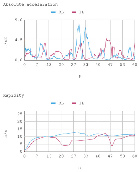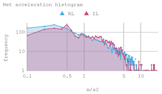 where R represents the reward; the sub-indexes represent distance, speed, collision, acceleration, and steering angles, respectively; dr represents the distance perceived by each detector ray in meters; v represents the tangential speed of the virtual automobile, in m/s; a represents acceleration, in m/s2; steering angle is the rotational angle, in degrees, reached by the steering wheel and the parameter f represents a dimensionless factor that allows for adjusting gains. In the experiment, a factor f = 0.1 is selected so the award function is defined for each step as: