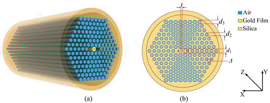 The three-dimensional and cross-sectional structures of the proposed V-DC-PCF PBS are shown in Figure 1a,b, respectively. From Figure 1a,b, the substrate material is silica, the air holes are arranged in a hexagonal lattice, and the hole to hole pitch is . The most central air hole with the diameter of is coated with the gold film, which has a thickness of t. When the light energy is propagated inside the V-DC-PCF coated with gold film, the free electrons on the gold film surface interact with the incident light field, generating the SPR and exciting the surface plasmon polariton (SPP) mode on the gold film surface. At a specific wavelength, the core mode of the V-DC-PCF and SPP mode have the same propagation constant, so the mode coupling occurs due to the phase-matching condition. The two air holes in the first layer along the X-direction of the V-DC-PCF are missing to form the two cores, which are labeled as the cores A and B, respectively. In the cladding region of the V-DC-PCF, there are two other sizes of air holes. The diameter of the smaller air holes on the left and right sides is , and the diameter of the larger air holes on the upper and lower sides is . In practice, such a V-DC-PCF can be fabricated with the stack-and-draw method, and the gold film can be selectively coated on the most central air hole by the chemical vapor deposition or magnetron sputtering technique [33,40,47].