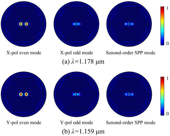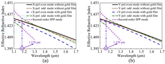 When the V-DC-PCF is coated without gold film and with gold film, the ERIs of the X-pol and Y-pol even and odd modes and second-order SPP mode are shown in Figure 2a,b, respectively. It can be seen from Figure 2a,b that for the V-DC-PCF without gold film, the ERIs of the X-pol and Y-pol even and odd modes decrease approximately linearly with the increase of wavelength. Moreover, the ERIs of the X-pol and Y-pol odd modes decrease more obviously than that of the X-pol and Y-pol even modes at the longer wavelength side, but the differences between the X-pol or Y-pol even and odd modes are very small. According to Equations (3) and (4), we can infer that the and will also change in the approximately linear trend and have large values. In contrast, when the V-DC-PCF is coated with gold film, the ERIs of the X-pol and Y-pol even modes still decrease approximately linearly as the wavelength increases. However, there are two cross points between the ERIs of the X-pol and Y-pol odd modes and second-order SPP mode at wavelengths 1.178 and 1.159 , respectively, where the phase-matching condition is satisfied. According to the coupled mode theory, the X-pol and Y-pol odd modes occur to couple with the second-order SPP mode at wavelengths 1.178 and 1.159 , respectively. In addition, it can be seen from Figure 2a,b that before the phase-matching wavelengths, the ERIs of the X-pol and Y-pol odd modes decrease rapidly, along with a relatively small and stable slope. Hence, the differences between the ERIs of the X-pol and Y-pol even and odd modes increase rapidly with the increase of wavelength. The ERIs of the X-pol and Y-pol odd modes increase significantly at wavelengths 1.178 and 1.159 , respectively, and there are maximum differences between the ERIs of the X-pol and Y-pol even and odd modes. Thus, the and will have significant changes at wavelengths 1.178 and 1.159 , respectively. But after the phase-matching wavelengths, the ERIs of the X-pol and Y-pol odd modes first decrease rapidly and then maintain a relatively stable slope. Finally, the relatively stable slope of the ERIs of the X-pol and Y-pol odd modes will be smaller than that of the ERIs of the X-pol and Y-pol even modes as the wavelength increases. Therefore, the differences between the ERIs of the X-pol and Y-pol even and odd modes first decrease and then increase as the wavelength increases. Figure 3a,b show the mode field distributions of the X-pol and Y-pol even and odd modes and second-order SPP mode calculated at wavelengths 1.178 and 1.159 , respectively. From Figure 3a,b, the mode field distributions of the X-pol and Y-pol even modes have no change at wavelengths 1.178 and 1.159 , respectively. But the mode field energies of the X-pol and Y-pol odd modes and second-order SPP mode occur to transfer at the two wavelengths. It further confirms the previous conclusion that only the X-pol and Y-pol odd modes and second-order SPP mode occur to couple at the phase-matching wavelengths.