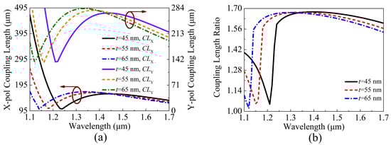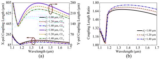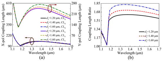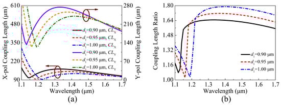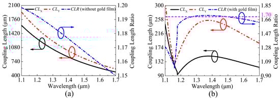 The relationships between the , , and and wavelength are shown in Figure 4a,b, respectively, when the V-DC-PCF is coated without gold film and with gold film. It can be seen from Figure 4a that when the V-DC-PCF is coated without gold film, the and decrease gradually, and the corresponding also decreases in an approximately linear trend as the wavelength increases. According to Equations (3) and (4) and the above analysis, when the V-DC-PCF is coated with gold film, the and decrease rapidly before the phase-matching wavelengths, and occur to change significantly at wavelengths 1.178 and 1.159 , respectively, as shown in Figure 4b. After the phase-matching wavelengths, the and increase first and then decrease. At this time, according to Equation (5), the decreases rapidly before wavelength 1.159 , has a significant change between wavelength 1.159 and 1.178 , and increases first and then decreases after wavelength 1.178 . However, after wavelength 1.178 , the overall change of the is relatively flat. In addition, the has the two intersections, where the is equal to 1.7. By comparing Figure 4a,b, the maximum for the V-DC-PCF with gold film is smaller than the minimum for the V-DC-PCF without gold film, which has a direct effect on the of the V-DC-PCF PBS. From the above analysis, it is possible to achieve a PBS with the shorter and larger by using a V-DC-PCF with gold film.
