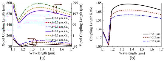 The variations of the , and of the proposed V-DC-PCF PBS are shown in Figure 8a,b when is chosen as 2.1, 2.2, and 2.3 , respectively. Figure 8a,b, as increases, the and gradually increase, but the shows a decreasing trend. In addition, the change of the phase-matching wavelength is not obvious, along with a small shift towards the short wavelength side. By comparing the results shown in Figure 5b, Figure 6b, Figure 7b, and Figure 8b, it is found that the change of has the most remarkable influence on the .