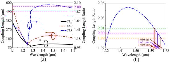 Based on the above analysis, the influence rule of the structure parameters of the proposed V-DC-PCF PBS on the , , and can be clearly known. Thus, the empirical steps for designing such a V-DC-PCF PBS can be summarized as following. First, by together adjusting and t, the phase-matching condition can be achieved at the shorter wavelength, and the value of the is close to 2. At this time, a relatively flat curve can be obtained in the desired band. Second, by together adjusting , , and , the curve with the relatively flat profile and the value of 2 can be obtained when the phase-matching wavelength does not change obviously. Thus, the optimized structure parameters of the proposed V-DC-PCF PBS are chosen as follows: = 1.00 , = 1.41 , = 1.50 , = 2.10 , and t = 46.5 nm. At this time, the variations of the optimal , , and of the proposed V-DC-PCF PBS and the corresponding zoomed flat region of the are shown in Figure 10a,b, respectively. From Figure 10a, the and have significant changes at the phase-matching wavelengths 1.277 and 1.243 , respectively. Moreover, the is approximately equal to 2 in a wide wavelength range of above 1.277 . From Figure 10b, the value of the changes from 1.974 to 2.051 in the wavelength range from 1.32 to 1.68 , and the maximum difference of the between wavelength 1.32 and 1.68 is 0.077. In addition, the values of the at wavelengths 1.610, 1.631, and 1.650 are 2.01, 2.00, and 1.99, respectively, which are approximately equal to 2. It is worth noting that although the value of the is also equal to 1.99, 2.00, and 2.01 at other three shorter wavelengths, but the corresponding slope variation of the is larger, which will affect the overall bandwidth to a great extent.