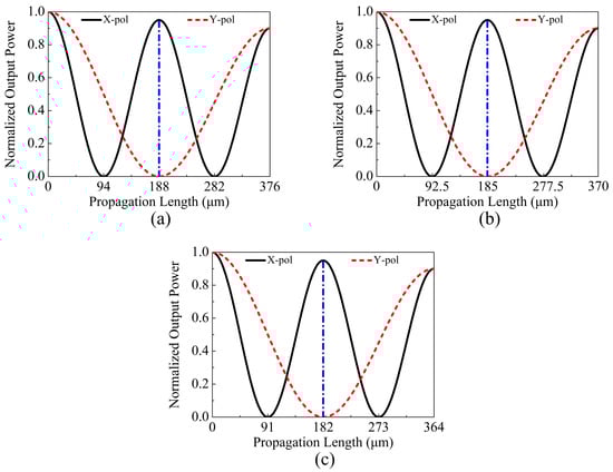 where and represent the of the X-pol and Y-pol, respectively, is the wavelength of the initial incident light, and , , , and represent the effective refractive indices (ERIs) of the even and odd modes in the X-pol and Y-pol, respectively.