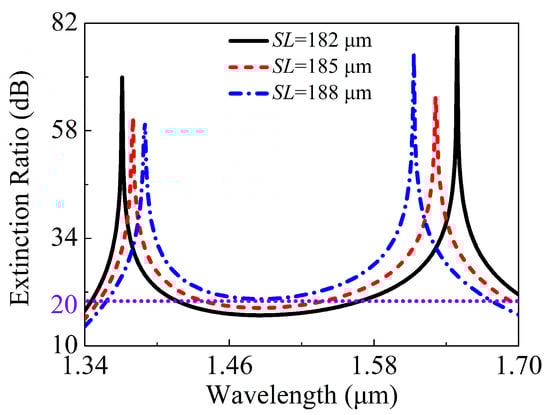 Figure 9a,b show the variations of the , , and of the proposed V-DC-PCF PBS when t is chosen as 45, 55, and 65 nm, respectively. It can be seen from Figure 9a that as t increases, the and increase at the short wavelength side and decrease at the long wavelength side. It can be seen from Figure 9b that as t increases, the increases at the short wavelength side and decreases at the long wavelength side, and the position of the phase-matching wavelength gradually shifts towards the short wavelength side.