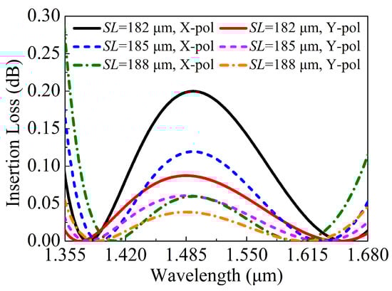 When the is equal to 182, 185, and 188 , respectively, the relationships between the in the core A of the proposed V-DC-PCF PBS and wavelength are shown in Figure 12. It can be seen from Figure 12 that for the of 182 and 185 , the are less than 20 dB in some wavelength ranges. In contrast, when is equal to 188 , the is always larger than 20 dB in a wide wavelength range from 1.359 to 1.677 . Figure 13 shows the relationships between the of the X-pol and Y-pol in the core A of the proposed V-DC-PCF PBS and wavelength when the is equal to 182, 185, and 188 , respectively. From Figure 13, for the of 182, 185, and 188 , the maximum of the X-pol and Y-pol is 0.22 dB in the wavelength range of 1.359 to 1.677 . Such a small can meet the actual application requirements. Because the proposed V-DC-PCF PBS has the ultra-short , the bending loss can be neglected. Therefore, we can draw a conclusion that for the proposed V-DC-PCF PBS, the optimal is 188 , the covers the entire E + S + C + L + U band, and the of the X-pol and Y-pol are less than 0.22 dB.