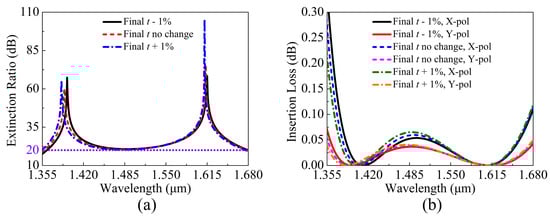 The in the core A and of the X-pol and Y-pol in the core A of the proposed V-DC-PCF PBS are shown in Figure 14a,b when t changes . From Figure 14a, the wavelength range of the larger than 20 dB changes slightly, which indicates that the proposed V-DC-PCF PBS still has a wide . From Figure 14b, the of the X-pol and Y-pol are always less than 0.22 dB in each . Thus, t has good error-tolerant rate in the actual coating process.