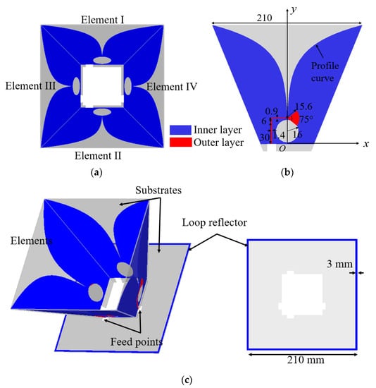 The configuration of the dual-polarized Vivaldi antenna is shown in Figure 1. Four obliquely positioned Vivaldi antenna elements are connected in a horn shape. Each Vivaldi element is fed by an optimized microstrip-slot balun. Two parallel elements are excited simultaneously with equal magnitude and phase for one polarization, so two orthogonal polarizations can be realized by exciting elements I and II, and elements III and IV, respectively. A thin square metallic loop is placed at the bottom of the antenna and acts as a reflector. Details of a single Vivaldi element with optimized dimensions are shown in Figure 1b. The exponential profile curves employed in this design (in mm) are calculated by: