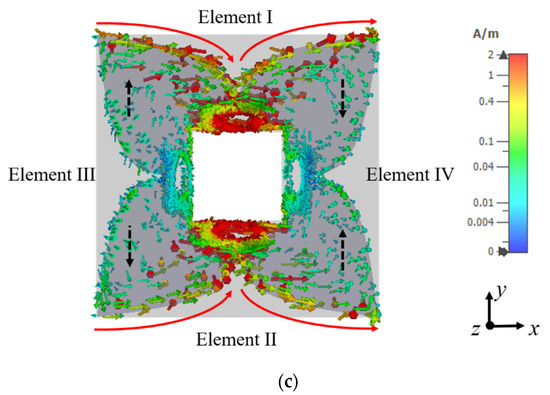 The current distribution at 0.5 GHz when elements I and II are excited for horizontal polarization is shown in Figure 2c. Most of the currents are distributed on the driven elements with a small amount of current flowing on the connected elements III and IV. Some current paths at low frequencies extend to the connected elements, which helps to slightly reduce the low-end operating frequency and improve the impedance matching at low frequencies. In addition, the currents on the two radiating fins of connecting elements III and IV are equal in magnitude but out of phase in the y-direction, thus providing a negligible contribution to the cross-polarized radiation. Theoretically, the resulting voltage across the feeding points of elements III and IV is zero. Therefore, a very high isolation level between the orthogonal ports can be achieved.